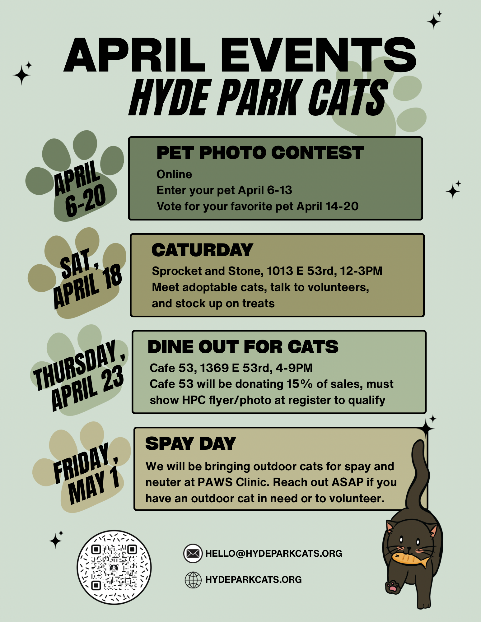 - Thursday, April 23rd, Cafe 53rd is hosting a fundraiser for us from 4-9PM. 15% of sales will he donated to Hyde Park Cats but you must show our flyer (or a photo if it) at the register.